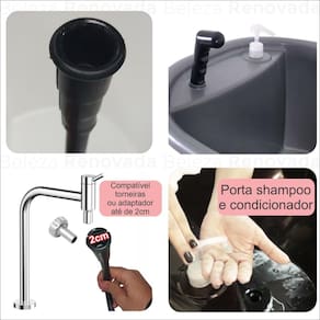 - Conta c/ mangueira p/ escoamento da agua.- Contém ducha de borracha c/ encaixe fácil.- Ducha que conecta em qualquer torneira.- Portátil - Fácil de montar e desmontar.- Não acompanha o aquecedor de água. Mas o lavatório suporta a instalação do aquecedor a parte (Consulte um técnico).