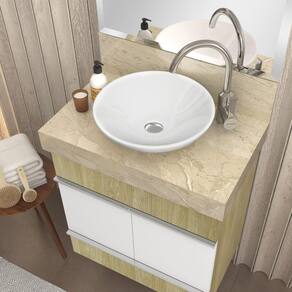 O Lavatório para Banheiro é fabricado em porcelanato técnico polido. Possui baixíssima absorção de umidade e é resistente a riscos e manchas. Produto vem com furação de 42mm de diâmetro para fixação da cuba de apoio e 32mm para fixação da torneira. Acompanha frontão frontal. Ideal para compor com os gabinetes Slim 60 da marca Bumi Móveis. Lavatório compatível também com gabinetes que tenham as seguintes medidas: Largura = 57,0cm e Profundidade = 34,4cm. O Produto já sai montado de fábrica, basta apenas fixá-lo sobre o gabinete e acompanha Manual de Instalação Garantia de 12 meses para defeito de fabricação. Não acompanha cuba e nem torneira. Escala de Brilho: Brilhante Possui Prateleiras: Não Suporta Até (kg): 10 kg Acompanha Cuba: Não Altura: 22,2 cm Ambiente Principal: Banheiro Cor: Travertino Cor do Produto: Travertino Estilo: Moderno Itens Inclusos: 1 Lavatório, 1 Frontão Frontal E Manual De Instalação. Largura: 60 cm Linha ou Coleção: Slim Manual de Montagem e Instalação: https://product-hub-prd.madeiramadeira.com.br/661532/documents/aa1be49a-194c-4f1a-a235-462146707735745841lavatriotop50eslim60.pdf Material Principal: Porcelanato Técnico Polido Necessita Montagem: Não Origem do Produto: Nacional Peso: 8,3 kg Possui Sifão: Não Profundidade: 36,5 cm Recomendações de Uso, Manutenção e Limpeza: Para limpeza e conservação utilizar somente detergente neutro. Nunca utilizar qualquer tipo de cera. Não utilizar produtos abrasivos (esponjas de aço ou saponáceos). Suporte para Toalheiro: Não Ean: 7908439681223