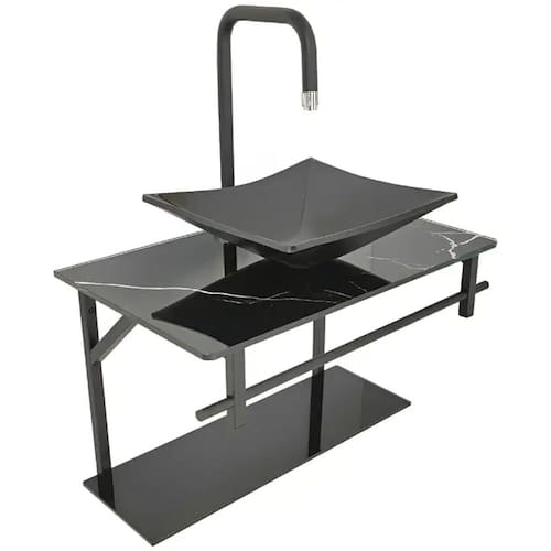 - Cor Preto Marmorizado. Cuba, tampo e prateleira em vidro lapidado 10mm. Suportes em metal resistente.
