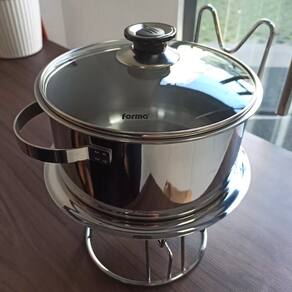 A panela rechaud possui capacidade para 5 litros, ideal para ser utilizada para manter a refeição quentinha para os momentos especiais. O rechaud conta com uma tampa de vidro facilitando visualizar os alimentos na hora do preparo, também possui uma saída de vapor possibilitando a redução da pressão interna, a tampa da panela possui um puxador de baquelite para garantir que você não queime as mãos no momento de retirar a tampa. é uma panela da marca Forma, de aço inox de ótima qualidade.