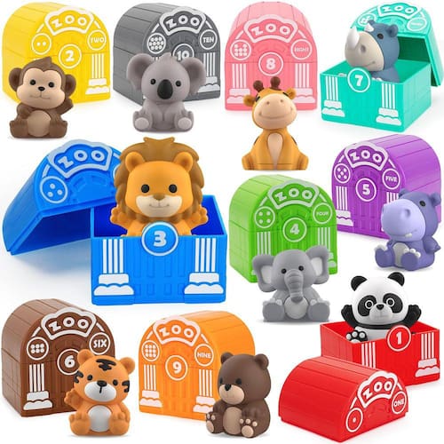 Brinquedos didáticos Montessori: As crianças podem conhecer e aprender sobre 10 animais de safári diferentes e identificar suas características em nossos brinquedos. As tampas do zoológico são impressas com números de 1 a 10 e os corpos têm pontos correspondentes aos números. Os bebês podem se divertir com jogos de aprendizagem de números e combinação de cores com base neles, exercitar suas habilidades de contagem, reconhecimento de cores, classificação e combinação. Os melhores brinquedos educativos para crianças pequenas, deixe nossos animais fofos acompanharem seus filhos durante a infância!