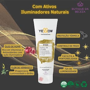 Leave-in creme iluminador yellow star é indicado para desembaraçar e conferir brilho a todos os tipos de cabelos. Aplicado antes da secagem, o leave-in para brilho yellow star ajuda a controlar o frizz, facilitando o desembaraço e a penteabilidade dos cabelos.