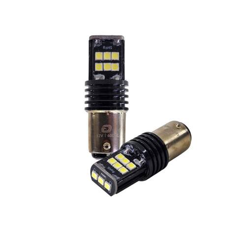 Cor da luz: Branco frio Temperatura de cor: 6000K Encaixe: BA15D - 2 polos 1157 Tensão: 12V Equivalente a: 21W Tipo de LED: SMD 3030 Fluxo luminoso: 900 lúmens Linha: Premium Canbus: Sim evita erro no painel na maioria dos veículos