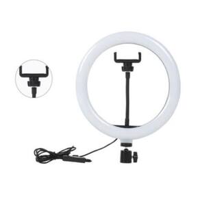 Iluminador LED com 10 polegadas de diâmetro, ideal para fotografia e filmagem. Suaviza a iluminação, proporcionando um acabamento profissional. Inclui suporte articulado para celular e ballhead para fixação em tripé. Possui uma única temperatura de cor.