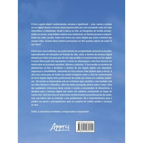 O livro Legado digital: conhecimento, decisão e significado – viver, morrer e enlutar na era digital aborda um tema atual experienciado por uma sociedade cada vez mais cibernética e midiatizada. Desde o banco on-line, as fotografias de família armazenadas na nuvem, propriedade criativa e/ou intelectual, ou história pessoal compartilhada nas redes sociais, todos nós temos um rastro digital que conta a história das nossas vidas. Quanto dessa história permanece on-line quando saímos de cena? O que fazer? O livro leva-nos à reflexão e ao conhecimento da complexidade existente na escolha, especialmente em situações de finitude da vida, sobre o destino da herança digital deixada por todos nós para que ela não seja perdida ou transformada em lixo digital. A morte física pode não representar a morte no ciberespaço e este livro fornece um roteiro para as principais questões, dilemas e soluções. O livro auxilia os usuários de plataformas on-line a decidirem o destino de seu legado digital com dignidade, segurança e sensibilidade, colocando em foco nossas vidas digitais após a morte. A obra traz como pano de fundo um estudo instigante sobre o nível de conhecimento do tema legado digital entre profissionais da saúde que atuam em cuidados paliativos. Tal estudo se desenvolveu sob um criterioso rigor científico, mas também sob um olhar histórico e filosófico, além da minha percepção afetiva sobre o tema. Uma das qualidades intrínsecas deste estudo é revelar a necessidade de discutirmos o desígnio para a herança digital que todos nós estamos construindo ao longo do nosso viver. Este livro traz um importante esclarecimento aos profissionais da saúde, mas sua leitura não se restringe a tais profissionais. Ela é importantíssima para o público em geral e, principalmente, para os usuários de mídias sociais e serviços on-line. Enfim, é uma leitura reveladora, enriquecedora e fascinante!