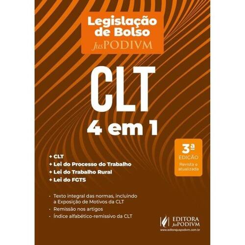 O LEITOR ENCONTRARÁ: • Texto integral das normas: • CLT • Lei do Processo do Trabalho • Lei do Trabalho rural • Lei do FGTS • Remissões nos artigos • Índice alfabético-remissivo da CLT POR QUE ESCOLHER O LIVRO "LEGISLAÇÃO DE BOLSO CLT 4 EM 1"? A Editora Juspodivm, reafirmando seu compromisso em oferecer o melhor conteúdo no formato mais adequado a você, tem a satisfação de apresentar mais um produto adaptado às suas necessidades. A Coleção Legislação de Bolso foi pensada exclusivamente para sua comodidade no que diz respeito à consulta rápida à legislação básica no dia a dia. Desta forma, cada obra traz uma seleção dos principais códigos e, eventualmente, alguma norma complementar fundamental relacionada à matéria abordada, em formato reduzido, para facilitar o manuseio e a portabilidade, mantendo a qualidade e a seriedade – características da Legislação Juspodivm que você já conhece. Este volume conta com a CLT na íntegra e as Leis 5.584/1970 (Normas de Direito Processual do Trabalho), 5.889/1973 (Lei do Trabalho Rural) e 8.036/1990 (Lei do FGTS), normas fundamentais para o estudo do Direito Trabalhista. As remissões são específicas e voltadas para os operadores desta área, com o objetivo de auxiliá-los na interconexão das normas. Para tornar a consulta mais dinâmica e didática, o conteúdo foi disposto de maneira que o leitor perceba de imediato as alterações do texto: os dispositivos que sofreram atualização em 2025 estão devidamente destacados. Com a publicação desta obra, reforçamos o compromisso de oferecer aos nossos leitores as melhores soluções editoriais para o seu dia a dia, seus estudos e seu bolso! *Edição atualizada até 09.01.2026.