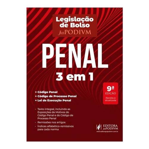 O LEITOR ENCONTRARÁ: • Texto integral das normas: • Código Penal • Código de Processo Penal • Lei de Execução Penal (Lei 7.210/1984) • Remissões nos artigos • Índice remissivo alfabético-remissivo para cada norma CONFORME: • Texto do Código Penal atualizado até a Lei Complementar 225/2026 (Código de Defesa do Contribuinte). • Texto do Código de Processo Penal atualizado pelas Leis 15.280/2025 (medidas protetivas de urgência a vítimas de crimes contra a dignidade sexual) e 15.272/2025 (conversão da prisão em flagrante em preventiva). • Texto da Lei de Execução Penal atualizado pela Lei 15.280/2025 (monitoração eletrônica dos condenados por crime contra a dignidade sexual). POR QUE ESCOLHER O LIVRO "LEGISLAÇÃO DE BOLSO PENAL 3 EM 1: CÓDIGO PENAL, CÓDIGO DE PROCESSO PENAL E LEI DE EXECUÇÃO PENAL!"? A Legislação de Bolso Juspodivm Penal 3 em 1 foi idealizada para ser uma ferramenta de consulta ágil e segura, com o intuito de atender suas necessidades no ambiente profissional ou na sala de aula, proporcionando leitura confortável e facilidade de localização dos artigos e temas desejados. Este volume conta com: Código Penal, Código de Processo Penal e a Lei de Execução Penal. Além disso, disponibilizamos a você um índice alfabético-remissivo para cada norma, desenvolvidos com todo cuidado para facilitar e agilizar a consulta. As remissões são específicas e voltadas para os operadores desta área, com o objetivo de auxiliá-los na interconexão das normas. Para tornar a consulta mais dinâmica e didática, o conteúdo foi disposto de maneira que o leitor perceba de imediato as alterações do texto: os dispositivos que sofreram atualização em 2024 e 2025 estão devidamente destacados. Com a publicação desta obra, reforçamos o compromisso de oferecer aos nossos leitores as melhores soluções editoriais para o seu dia a dia, seus estudos e seu bolso! Contem conosco! *Edição atualizada até 09.01.2026.