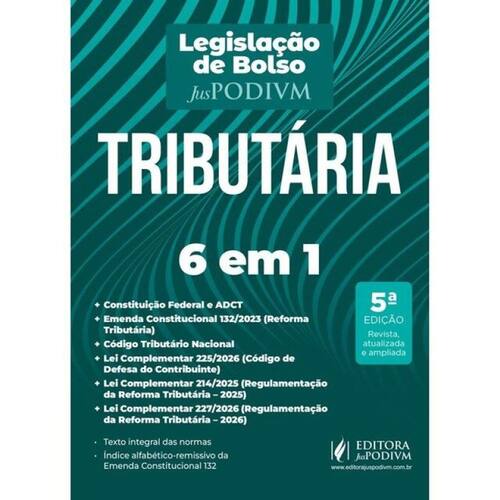 O LEITOR ENCONTRARÁ: • Constituição Federal e ADCT • Emenda Constitucional 132/2023 (Reforma Tributária) • Código Tributário Nacional (conforme a LC 227/2026) + Lei Complementar 225/2026 (Código de Defesa do Contribuinte) + Lei Complementar 214/2025 (Regulamentação da Reforma Tributária - 2025) + Lei Complementar 227/2026 (Regulamentação da Reforma Tributária - 2026) CONHEÇA O PRODUTO: A Editora Juspodivm, reafirmando seu compromisso em oferecer o melhor conteúdo no formato mais adequado a você, tem a satisfação de apresentar mais um produto adaptado às suas necessidades. A Coleção Legislação de Bolso foi pensada exclusivamente para sua comodidade no que diz respeito à consulta rápida à legislação básica no dia a dia. Desta forma, cada obra traz uma seleção dos principais códigos e, eventualmente, alguma norma complementar fundamental relacionada à matéria abordada, em formato reduzido para facilitar o manuseio e a portabilidade, mantendo a qualidade e a seriedade características da Legislação Juspodivm que você já conhece. Este volume conta com a Constituição Federal (incluindo o ADCT), com a Emenda Constitucional 132 (Reforma Tributária), com o Código Tributário Nacional, com as Leis Complementares 214/2025 (Regulamentação da Reforma Tributária - 2025) e 227/2026 (Regulamentação da Reforma Tributária - Novidade de 2026) e com o Código de Defesa do Contribuinte (Novidade de 2026). Além disso, disponibilizamos a você um índice alfabético-remissivo detalhado da Emenda Constitucional 132, desenvolvido com todo cuidado para facilitar e agilizar a consulta a essa importante novidade legislativa! As remissões são específicas e voltadas para os operadores de cada área, com o objetivo de auxiliá-los na interconexão das normas. Para tornar a consulta mais dinâmica e didática, o conteúdo foi disposto de maneira que o leitor perceba de imediato as alterações do texto: os dispositivos que sofreram atualização em 2025 e 2026 estão devidamente destacados. Com a publicação desta obra, reforçamos o compromisso de oferecer aos nossos leitores as melhores soluções editoriais para o seu dia a dia, seus estudos e seu bolso! *Edição atualizada até 13.01.2026