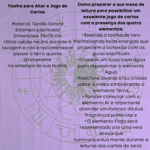 A Legítima Toalha Zódiaco Jogos De Cartas da Bialluz é ótima para te auxiliar durante o jogo de cartas, por ser um elemento que proporciona alta elevação enérgica. Você também pode usar para decorar seu altar, com certeza ficara ainda mais lindo e com muita energia positiva. Nossa toalha possui altíssima qualidade na impressão com pontos de brilho e é confeccionada em tecido oxford que não amassa e tem longa durabilidade.