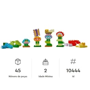 Lego Duplo Jardim Criativo e Flores 45 Peças Infantil 10444 Este brinquedo de aprendizagem estimula a imaginação das crianças em idade pré-escolar, ajudando-as a recriar o mundo que veem todos os dias. Conforme usam os 45 tijolos para construir seu jardim de brinquedo, as crianças começam a reconhecer números, aprender cores e começar a melhorar sua linguagem e aprimorar habilidades motoras finas. Elas também desenvolvem perseverança ao empilhar os diferentes tijolos para criar criaturas e flores.