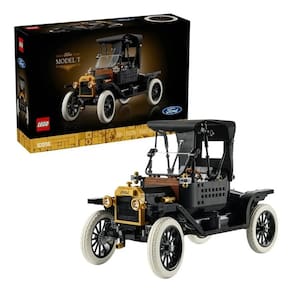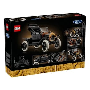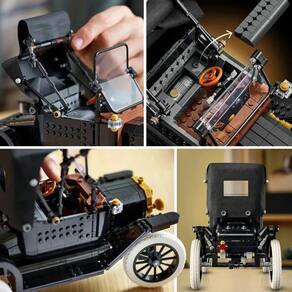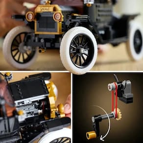 Celebre um ícone da história automóvel com o kit de carro LEGO® Icons Ford Model T (11376) para adultos. Esta réplica autêntica do automóvel de 1910 inclui um tejadilho dobrável em tecido, para-brisas dobrável com divisória e porta única para passageiros. Outras características incluem a bagageira que abre e uma cabine de condutor altamente detalhada com direção funcional. Levante o assento e aceda ao depósito de combustível. Levante os painéis do capô de ambos os lados para admirar o motor e rode a manivela para girar a ventoinha. Com uma carroçaria negra, detalhes dourados e grandes rodas raiadas brancas, este modelo de carro vintage é uma exposição elegante para a casa ou escritório. Este modelo premium é uma excelente ideia de presente para fãs de carros clássicos americano. Tamanho aproximado de 29 cm x 20 cm.