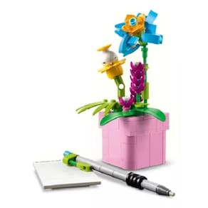 Os fãs de LEGO podem escolher entre 3 kits de flores diferentes para construir: uma máquina de escrever com flores de brinquedo; um instrumento de brinquedo keytar em um suporte com flores; ou um vaso de flores com caneta e caderno. O conjunto de brinquedos reconstruível também vem com 3 adesivos com frases atenciosas, que as crianças podem usar para decorar os modelos construídos com tijolos.