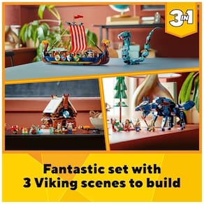 3 brinquedos Viking em 1 conjunto As crianças vão adorar este conjunto LEGO Creator 3 em 1 Viking Ship e Midgard Serpent 31132, com um Viking Ship, uma casa Viking e um brinquedo de lobo Fenris. Opções de jogo ilimitadas As crianças podem escolher sua aventura viking um navio viking lutando contra uma serpente temível, uma casa viking com um dragão ou um lobo nórdico enfrentando 4 vikings. Modelos altamente articuláveis O brinquedo Midgard Serpent tem cabeça, cauda, corpo, mandíbula e barbatanas articuláveis, e o brinquedo lobo tem pescoço, mandíbula e pernas articuláveis para ajudar as crianças a realizar ações em movimento rápido. Repleto de recursos O navio Viking é adornado com 8 escudos e inclui uma vaca construída em tijolos e 2 corvos construídos em tijolos, enquanto o telhado da casa Viking pode ser removido. 4 minifiguras O playset vem com 4 minifiguras Viking das para contar histórias com o navio, a casa ou o brinquedo do lobo Marca: Não Informado