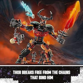 Este brinquedo de Super-herói LEGO Marvel Figura de Construção Thor vs. Surtur 76289 é baseado em uma cena do sucesso da Marvel Studios Thor: Ragnarok. Com personagens icônicos, recursos eletrizantes e infinitas oportunidades para aventuras de Super-herói imaginativas, esse conjunto LEGO Marvel é um ótimo presente para crianças maiores de 8 anos. O conjunto inclui 3 minifiguras: o Thor e 2 guerreiros demônios de fogo. Assim como no filme, o Thor se liberta das correntes que o prendem e batalha contra Surtur. A figura articulada para construir de Surtur pode ser posicionada em diferentes poses de ação. Ele empunha uma grande espada de fogo e usa uma coroa com chifres. Um conector transparente permite que as crianças conectem a minifigura do Thor ao Surtur construível para dar a aparência de que o Vingador está voando. Para mais diversão digital, os construtores podem ampliar, girar modelos em 3D e acompanhar seu progresso usando o aplicativo LEGO Builder intuitivo.