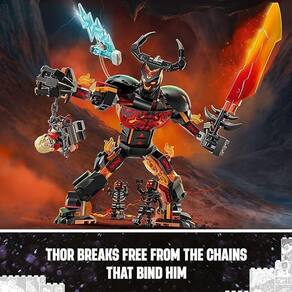 Este brinquedo de Super-herói LEGO Marvel Figura de Construção Thor vs. Surtur 76289 é baseado em uma cena do sucesso da Marvel Studios Thor: Ragnarok. Com personagens icônicos, recursos eletrizantes e infinitas oportunidades para aventuras de Super-herói imaginativas, esse conjunto LEGO Marvel é um ótimo presente para crianças maiores de 8 anos. O conjunto inclui 3 minifiguras: o Thor e 2 guerreiros demônios de fogo. Assim como no filme, o Thor se liberta das correntes que o prendem e batalha contra Surtur. A figura articulada para construir de Surtur pode ser posicionada em diferentes poses de ação. Ele empunha uma grande espada de fogo e usa uma coroa com chifres. Um conector transparente permite que as crianças conectem a minifigura do Thor ao Surtur construível para dar a aparência de que o Vingador está voando. Para mais diversão digital, os construtores podem ampliar, girar modelos em 3D e acompanhar seu progresso usando o aplicativo LEGO Builder intuitivo.