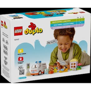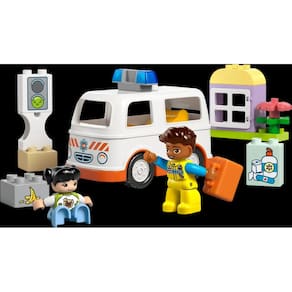 Crianças atenciosas brincam de cenas de resgate com o brinquedo Duplo Town Ambulância e Motorista (10447) com 19 peças, para crianças pré-escolares Este brinquedo para pequenos inclui uma ambulância de brinquedo pilotável e 2 figuras LEGO Duplo, um paramédico e uma menina, para brincadeiras criativas e imaginativas