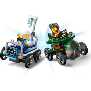 - Este divertido conjunto de carros de corrida inclui dois carrinhos de corrimão e duas minifiguras.