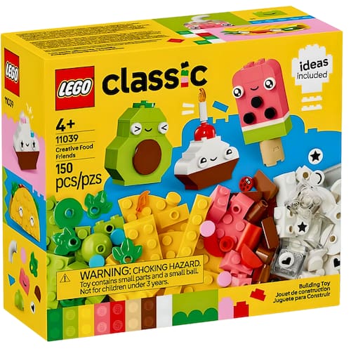 Descrição do produto : " LEGO Classic Creative Food Friends (11039) é um conjunto de construção versátil para crianças de 4 anos ou mais. Com uma variedade de personagens divertidos de comida, este brinquedo imaginativo é ideal para brincadeiras de faz de conta. Com infinitas oportunidades para construir, reconstruir e explorar a diversão de construção livre, este conjunto LEGO para iniciantes desenvolve a confiança, a concentração e as habilidades de resolução de problemas dos mais jovens. As crianças usam a variedade colorida e cativante de tijolos de construção e peças especiais – como olhos, bocas e vários elementos decorativos – para construir 4 brinquedos fofos Food Friend: um cupcake, sorvete, abacate e taco. A diversão criativa continua enquanto as crianças misturam os tijolos para reconstruir os modelos em um bolo com granulados, bebida de chá de bolhas, pêra e um panini. À medida que as crianças se tornam mais confiantes em suas habilidades de construção, elas podem seguir o guia de construção intuitivo para mudar expressões, formas ou cores para criar novos Food Friends, incluindo um sorvete verde, caixa de suco, fatia de melancia, barra de chocolate e um mega sanduíche. : " Detalhes técnicos : Marca: Lego : Referência: 11039 : Idade recomendada: 4 : Quantidade de peças: 150 : Possui Luzes: Não : Possui Sons: Não : Dimensões aproximadas da embalagem: 15 x 14 x 6 cm (A x L x C) : Ean: 673419407083 :