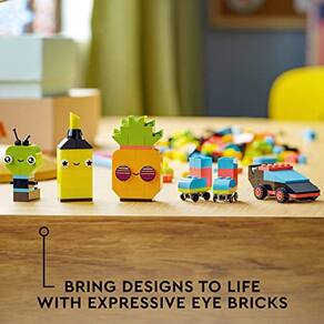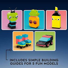 Dê o pontapé inicial no desenvolvimento criativo das crianças com o conjunto de brinquedos LEGO Classic Creative Neon Fun (11027). Com sugestões de modelos rápidos de construção e diversão infinita de construção livre, o conjunto atraente inspira construtores iniciantes com 5+ anos a se entregarem à sua paixão por arte e design. Este versátil kit de construção contém 333 tijolos de construção LEGO em vários tamanhos e cores neon brilhantes. 18 das peças apresentam olhos expressivos que as crianças podem usar para dar vida às suas criações. Instruções de construção impressas estão incluídas para 5 modelos divertidos - um abacaxi, caneta marca-texto, carro, alienígena e patins - dando às crianças a confiança criativa que precisam para construir o que imaginarem! Uma versão digital das instruções de construção do conjunto também pode ser encontrada no aplicativo LEGO Builder. Os brinquedos de construção LEGO Classic colocam ideias e inspiração nas mãos das crianças e oferecem uma oportunidade para os adultos compartilharem marcos divertidos e de desenvolvimento com seus filhos. Este conjunto de caixas de tijolos LEGO Classic Creative Neon Fun é um presente criativo fantástico para crianças artísticas com 5+ anos de idade.