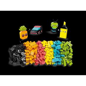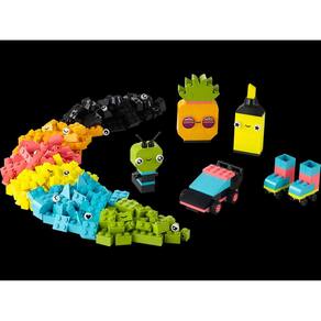 Peças em tons néon para crianças criativas. Inspire os jovens construtores com 333 peças de tons néon. Inclui sugestões de modelos divertidos e diversão ilimitada! A diversão começa logo ao tirar da caixa Guias para construir um ananás, marcador, carro, extraterrestre e patins dão confiança para construir qualquer coisa! 333 peças néon Peças vibrantes de vários tamanhos para jovens construtores. 333 peças néon Peças vibrantes de vários tamanhos para jovens construtores. 18 peças de olhos Olhos expressivos dão vida às criações das crianças. Promova o desenvolvimento criativo das crianças Este set interminavelmente divertido põe em aberto a brincadeira e a autoexpressão criativa nas mãos dos jovens construtores. Ideal para jovens construtores As instruções de construção digitais podem ser vistas na maioria dos dispositivos e estão incluídas na app LEGO® Builder.