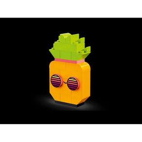 Peças brilhantes para crianças criativas Este kit de construção versátil contém 333 peças em vários tamanhos e cores néon vibrantes. 18 das peças apresentam olhos expressivos que as crianças podem utilizar para dar vida às suas criações. Estão incluídas instruções de construção impressas para 5 modelos divertidos: um ananás, um marcador, um carro, um extraterrestre e patins – dando às crianças a confiança criativa de que necessitam para construir o que quer que imaginem! Também pode ver uma versão digital das instruções de construção na aplicação LEGO Builder.