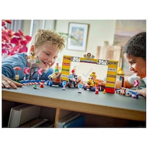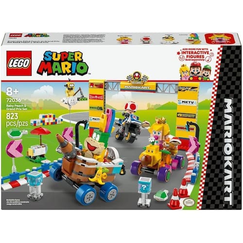LEGO Conjunto Bebê Peach e Grande Prémio Preparar, apontar, construir As crianças criam sua própria pista e veículos de Mario Kart, pilotam rumo à vitória e vivem aventuras com personagens icônicos neste LEGO Super Mario: Mario Kart Conjunto Bebê Peach e Grande Prémio 72036 com 823 peças. Uma incrível ideia de presente de personagens da Nintendo para crianças e jogadores maiores de 8 anos, este kit de brinquedo de corrida personalizável inclui os veículos Wild Wiggler, Autonave e Standard Bike que disparam cascos, um portão de partida, barreiras de pista, cones de trânsito, um pódio de vencedores, o carrinho de doces do Toad e a nuvem de Lakitu. O conjunto contém as figuras da Bebê Peach, Lakitu, Lemmy e o Toad.