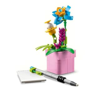 Os fãs de LEGO podem escolher entre 3 kits de flores diferentes para construir: uma máquina de escrever com flores de brinquedo; um instrumento de brinquedo keytar em um suporte com flores; ou um vaso de flores com caneta e caderno. O conjunto de brinquedos reconstruível também vem com 3 adesivos com frases atenciosas, que as crianças podem usar para decorar os modelos construídos com tijolos.
