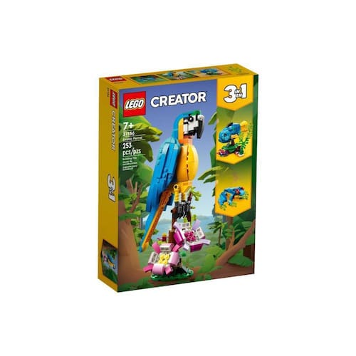 Os pequenos construtores e os fãs apaixonados por animais com mais de 7 anos podem viajar até às profundezas da floresta tropical para desfrutar de histórias repletas de ação com este set de construção LEGO Creator 3em1 Papagaio Exótico 31136 . Inclui um papagaio colorido que roda completamente o seu corpo enquanto está sentado num ramo da árvore, e move as suas asas e a cauda.