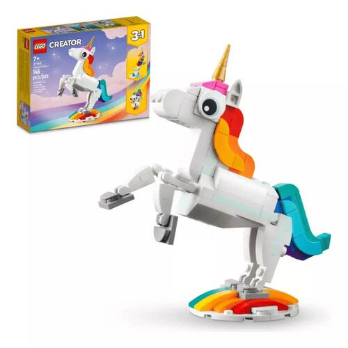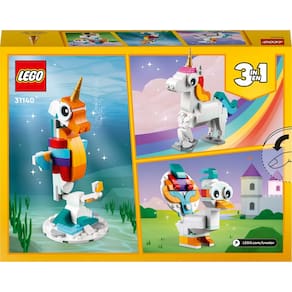 Brinquedos lúdicos para crianças de 7 anos combinam diversão e aprendizagem. Com LEGO Creator 3 em 1 – Unicórnio Mágico (31140), meninos e meninas vão se encantar com animais lendários em jornada criativa por belos contos de fada. Os conjuntos de construção LEGO Creator 3 em 1 são brinquedos educativos e divertidos, com 3 experiências em apenas 1 caixa. Este modelo traz 145 peças que vão despertar a curiosidade dos pequenos construtores que amam animais mitológicos. O desafio começa por construir um unicórnio mágico, que fica em pé nas quatro patas ou empinado em duas patas, depois reconstruí-lo como cavalo marinho e transformá-lo em bicho pavão com cauda colorida. O brinquedo de montar oferece infinitas possibilidades de criação personalizada, levando a imaginação infantil às alturas. Todas as três figuras de animais são articuláveis para deixar o jogo de fantasia ainda mais realista. Aviso legal• Recomendado a partir dos 7 anos.