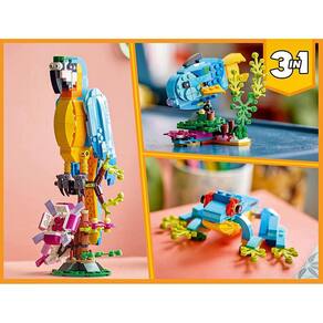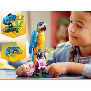 Os fãs de animais terão a oportunidade de construir 3 brinquedos de animais exóticos diferentes (utilizando as mesmas peças) com este conjunto de construção LEGO Creator 3em1 Papagaio Exótico (31136). Eles poderão montar um papagaio colorido que pode girar o seu corpo totalmente enquanto pousa em um galho de árvore e move suas asas e cauda. Em seguida poderão reconstruir em um peixe brincalhão nadando no fundo do mar ou um sapo sapeca que pode mover suas pernas.