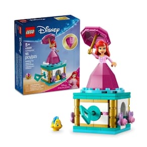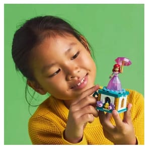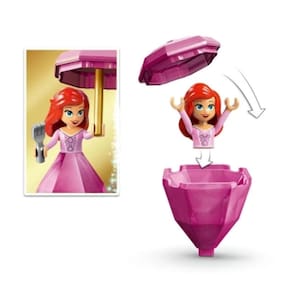 Encante as crianças e os fãs da Pequena Sereia da Disney com 5 anos ou mais com este kit de construção LEGO® | Disney Princess Twirling Ariel (43259), que contém um suporte de brinquedo de fantasia para construir com prato giratório, chave, garfo e espaço para Linguado, além de um "diamante" nas laterais. As crianças podem guardar Ariel dentro do vestido "diamante", com o guarda-chuva como tampa para mantê-la segura.