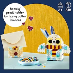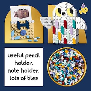 Conhece um amante de animais ou fã de Harry Potter que gosta de arte e design? Eles podem explorar suas paixões com este útil e divertido LEGO DOTS Hedwig Pencil Holder (41809) conjunto de artesanato de brinquedo para crianças de 6+ anos de idade. Este conjunto de acessórios de mesa com tema de Harry Potter é um ótimo presente para brincadeiras diárias, como acessórios para o quarto das crianças ou voltando para o material escolar, e possui um pote de lápis com uma frente em forma de coruja e asas móveis, um porta-notas em forma de carta e muitos azulejos LEGO DOTS. A montagem é fácil com a ajuda do folheto incluído. Os exteriores dos suportes oferecem muito espaço para as crianças projetarem e adicionarem seus padrões favoritos e personalizarem os itens de acordo com seu quarto, paixão ou humor. O kit também inclui inspiração de design, por precaução! Os conjuntos de artesanato DOTS para crianças apresentam aos pequenos a alegria da brincadeira e experimentação LEGO enquanto criam diferentes itens vestíveis e acessórios para quartos infantis. Vale tudo com este útil e divertido pote de lápis e suporte de foto/mensagem, porque a magia e o controle estão na imaginação de uma criança. As crianças simplesmente abrem a caixa e se juntam à diversão imaginativa enquanto criam um organizador de mesa personalizado.