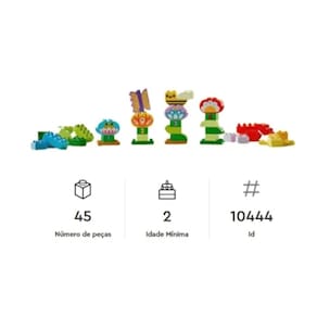 – Uma variedade de blocos de brinquedo retrata números, flores e animais para que as crianças possam recriar e se envolver com o mundo que veem ao seu redor Inclui 3 personagens animais LEGO® DUPLO® – Este brinquedo da natureza para crianças em idade pré-escolar vem com 3 figuras: um sapo, uma borboleta de brinquedo e uma abelha Brinquedo de aprendizagem – As crianças usam habilidades motoras finas ao combinar os blocos de brinquedo para recriar o que veem ao seu redor e perseverança ao fazer com que o modelo fique exatamente do jeito que elas querem Presente divertido LEGO® DUPLO® para crianças pequenas – Este brinquedo da natureza é um ótimo presente de feriado ou aniversário para meninos e meninas de 2 anos ou mais que amam brinquedos de animais Instruções de construção digitais – O aplicativo LEGO® Builder apresenta uma versão digital das instruções incluídas neste brinquedo para crianças pequenas, que foi altamente testada para garantir uma experiência de jogo segura Presentes educativos para brincar e aprender – os brinquedos de construção LEGO® DUPLO® ajudam as crianças em idade pré-escolar a entender o mundo ao seu redor enquanto constroem e brincam com seus pais e cuidadores Dimensões – Este brinquedo de aprendizagem para crianças pequenas mede mais de 35 cm de largura com todos os tijolos da base colocados de ponta a ponta