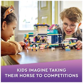 Jogando os sonhos de cuidar de cavalos A imaginação das crianças viaja para s horizontes com o brinquedo Horse Show Trailer 41722 enquanto encenam turnês com seus amigos para eventos de equitação. Há muito na caixa Este extenso conjunto inclui um trailer, 2 brinquedos de cavalo, um carro de reboque SUV, além de 3 minibonecas, incluindo LEGO Friends Emma e uma figura de cachorro para amplas possibilidades de dramatização. Recursos divertidos Os quartos de dormir ficam no teto do trailer, que é articulado para revelar o compartimento dos cavalos. Há também um armário para troféus, além do carro ser dirigível com portas que se abrem. Interpretando o mundo real Embalado com acessórios de brinquedo autênticos, como rédeas de cavalo, capacetes, copos, medalhas e saltos, este playset aumenta a imaginação e desperta horas de brincadeiras criativas. Presente de aniversário para crianças com mais de 8 anos Este brinquedo LEGO Friends repleto de recursos pode ser dado como presente de aniversário, presente de feriado ou presente de ocasião especial para crianças que amam cavalos ou modelos de veículos realistas Marca: Não Informado