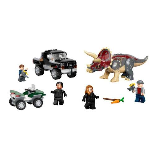 LEGO Jurassic World Dominion Emboscada de Triceratops Deixe a ação esmagadora e rápida começar com este incrível conjunto de brinquedo Lego Emboscada de Triceratops 76950 com 210 peças. O presente perfeito para crianças criativas que gostam de veículos espetaculares e dinossauros. Contém uma caminhonete com parte dianteira que se solta e que é facil de reconstruir após ter sido atingida pelo boneco Triceratops, e também um buggy de fuga. Inspirado no filme Jurassic World Dominion inclui 4 mini figuras: Claire Dearing, Franklin Webb e 2 guardas da segurança, e também um tranquilizador e cenoura para inspirar as crianças. Homologação Inmetro: 0240/22-BQ-04 Ean: 673419344890