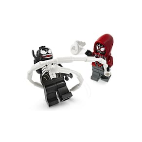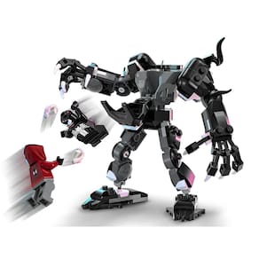 O mech Venom de construir e brincar totalmente ajustável inclui pernas e braços articulados, bem como mãos com garras suficientemente grandes para agarrar uma minifigura. O set também inclui uma minifigura de Miles Morales com 2 disparadores de teias e uma corda de teias flexível, que pode ser colocada em diversos pontos do brinquedo para construir do mech Venom.