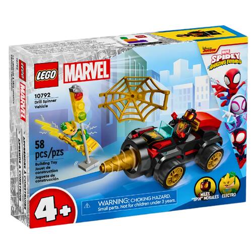 Presenteie os fãs do Aranha com o brinquedo de super-herói LEGO 4+ Drill Spinner Vehicle (10792). Com cores vivas, personagens familiares e recursos divertidos, este conjunto versátil foi especialmente projetado para aumentar a confiança, melhorar as habilidades de resolução de problemas e inspirar brincadeiras imaginativas sem fim em crianças, meninos e meninas com mais de 4 anos. Este brinquedo para construir do Disney+ Spidey e seus incríveis amigos contém um carro do Homem-Aranha com uma seção frontal giratória, uma minifigura de Miles “Spin” Morales e uma minifigura Electro. O conjunto vem com um chassi Starter Brick para ajudar as crianças a iniciar a construção. Instruções intuitivas são fornecidas na forma de um guia colorido de histórias ilustradas.