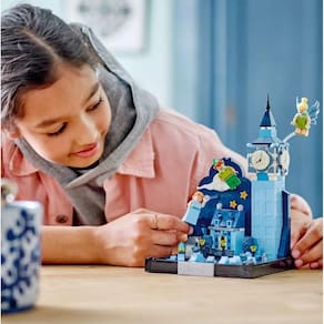 O conjunto inclui a icônica torre do relógio Big Ben, um fundo do céu noturno, casas, árvores, luzes de rua e muito mais. Os mostradores de relógio e a lua brilham no escuro, trazendo vida e encanto à cena. A placa Disney100 na base do conjunto mostra o orgulho em fazer parte das celebrações do Disney100.