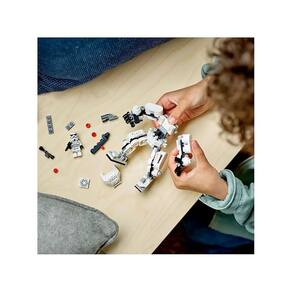 Traje de robô posicionável – Esse brinquedo construível tem mãos, braços, pernas e pés posicionáveis, um cockpit que abre para uma minifigura, um disparador de pinos grande e um clipe para o blaster da minifigura LEGO do Stormtrooper.