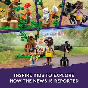 As crianças a partir dos 6 anos que adoram a encenação e a vida selvagem vão encontrar muita inspiração nesta LEGO Friends Carrinha de Imprensa 41749 . A trabalhadora Aliya está empenhada em relatar as últimas notícias para o centro comunitário. Dentro da carrinha, a Aliya tem tudo o que precisa para criar e partilhar notícias, incluindo ecrãs, luzes, câmaras, microfones, um caderno e uma caneta. As crianças podem contar a história enquanto um lenhador chega para cortar uma árvore. Depois de filmarem a história, as crianças podem levar a Aliya até à sala de controlo no interior da carrinha para editar e transmitir as notícias. O set inclui 2 minibonecos, 1 microboneco e muitos acessórios. Aumente a diversãoAs crianças podem desfrutar de uma aventura de construção fácil e intuitiva com a aplicação LEGO Builder. Aqui elas podem ampliar e rodar modelos em 3D, guardar sets e acompanhar o seu progresso. Conheça a próxima geração de Heartlake City Convide as crianças a desenvolver as suas paixões ao explorar o novo mundo LEGO Friends com as suas diferentes personagens.