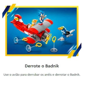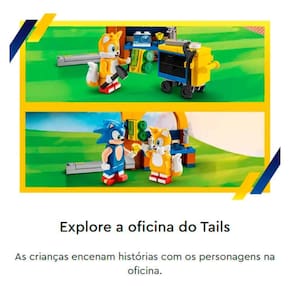 LEGO Sonic - Oficina do Tails e Avião Tornado - 376 peças - Lego: Construa e brinque com o Sonic e o Tails. O conjunto LEGO Sonic the Hedgehog Oficina do Tails e Avião Tornado traz brincadeira imaginativa em alta velocidade. Detalhes: • Construa o avião Tornado e salve o dia: As crianças constroem o avião Tornado e oficina e usam o avião para coletar anéis, derrotar Badnik e resgatar o animalzinho. • As crianças podem criar fugas emocionantes com este conjunto LEGO Sonic the Hedgehog Oficina do Tails e Avião Tornado (76991) • Inspiradas por suas aventuras e personagens favoritos do Sonic, as crianças podem reimaginar missões emocionantes enquanto constroem o percurso. • Elas podem se divertir usando o avião Tornado para coletar anéis e derrubar o Buzz Bomber Badnik para libertar o Clucky capturado. • 4 personagens e acessórios: Esse conjunto de ação inclui os personagens do Sonic, Tails, um Clucky, Buzz Bomber e muitos acessórios para o faz de conta • 2 maneiras de brincar: Após mandar os heróis pelo percurso, as crianças podem desfrutar de uma mudança de ritmo enquanto criam suas próprias histórias para o Sonic e Tails, cuidando do Clucky ou passando tempo na oficina • Medidas: A oficina mede mais de 9 cm de altura, 12 cm de largura e 9 cm de profundidade Informações: • Produto: Blocos de Montar Oficina do Tails e Avião Tornado 376 peças • Marca: LEGO • Coleção: LEGO Sonic the Hedgehog • Tipo: Blocos de Montar • Categoria: Blocos de Montar e Cia • Tamanho (C x A x L): 12 x 09 x 09 cm • Conteúdo: 376 peças • Recomendação: para crianças a partir de 06 anos de idade Especificações: • Referência: 76991 • Código de Barras: 673419376006 • Embalagem (C x A x L): 26 x 22 x 06 cm • Embalagem (Peso): 0.475 kg • Material / Composição: Plástico • Registro: 005 828/2021 • Certificado: Órgãos Autorizados - OCP´S (Organismos de Certificação de Produtos) Benefícios de brincar: • Eleva a autoestima • Exercita a memória • Estimula o raciocínio • Exercita o imaginário • Desenvolve a criatividade • Desenvolve percepção visual • Desperta a atenção e curiosidade • Desenvolvimento neuropsicológico • Estimula habilidades motoras básicas • Incentiva a comunicação e linguagem • Desenvolve aspectos emocionais e afetivo • Estimula o reconhecimento de formas e cores Aviso: • As imagens são meramente ilustrativas • Os pesos, tamanhos e medidas são aproximados • As cores e estampas dos produtos podem ter variações • As informações são de responsabilidade do fabricante ou fornecedor