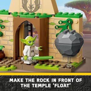Templo Jedi de Tenoo – Inclui uma função de pedra “flutuante”, uma cozinha com uma caixa de leite azul construível, um beliche com uma escada dobrável, 2 clipes para sabres de luz e um elemento de cristal