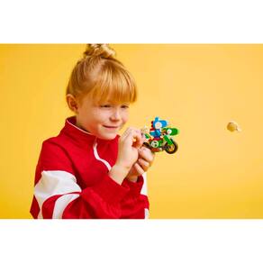 Descrição do produto : Acelere para uma ação emocionante de dirigir e derrapar com este conjunto de brinquedo de aventura colecionável LEGO Super Mario: Mario Kart – Yoshi Bike para crianças (72031). Uma ideia de presente emocionante da Nintendo para meninos, meninas e jogadores de 7 anos ou mais, o conjunto apresenta um modelo de tijolos da Yoshi Bike e, pela primeira vez em um conjunto LEGO Super Mario, uma figura de brinquedo Light-Blue Yoshi. Ajude o Light-Blue Yoshi a dirigir a moto entre 4 cones de trânsito, lançar conchas da moto e desviar da Banana. : Detalhes técnicos : Marca: Lego : Referência: 72031 : Idade recomendada: 7 : Quantidade de peças: 133 : Possui Luzes: Não : Possui Sons: Não : Dimensões aproximadas da embalagem: 19 x 13 x 4 cm (A x L x C) : Ean: 673419405621 :