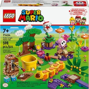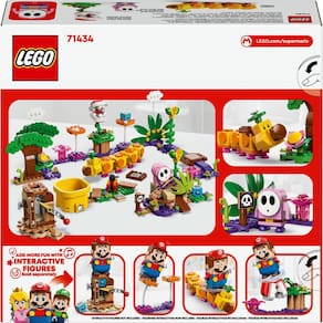 Crie fases da Selva Gelatinosa com este Conjunto Construtor! Descanse pela fogueira com sua figura interativa (não incluída). Use a Máquina de Personalização para selecionar as recompensas dos 2 blocos ?. Pule na Tubulação especial: Speed Run para iniciar um desafio de velocidade. Navegue por águas perigosas. Ande no Wiggler pelo pântano venenoso e derrote o Shy Guy rosa e a planta Piranha!