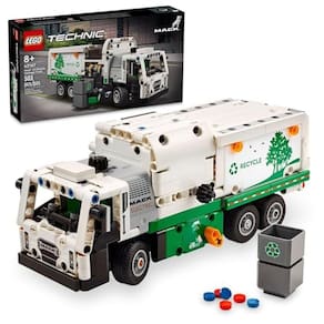 Brinquedo de caminhão para crianças a partir de 8 anos O LEGO Technic Mack LR Electric Garbage Truck para meninos e meninas apresenta um carregador lateral para agarrar, levantar e despejar as latas de lixo.