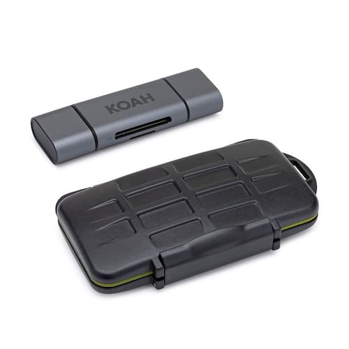- Leitor de cartão Koah PRO 2 em 1 com estojo de armazenamento de memória robusto: leia seus arquivos e fotos em uma variedade de cartões de memória e mantenha-os seguros e protegidos em qualquer lugar com o leitor de cartão SD Koah PRO 2 em 1 Aluminium Shell OTG com estojo de transporte Koah Pro Rugged Memory Storage.