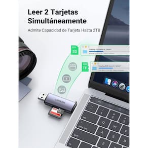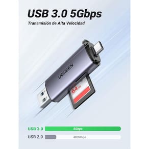 Mais detalhes do leitor de cartão ugreen usb c + usb a Leitor de cartão 2 em 1, ideal para celular e pc este leitor de cartão usb tipo c é para transferir arquivos entre um dispositivo usb tipo c. Possui duas conexões um conector tipo c compatível com celulares, tablets e computadores com porta tipo c um conector usb 3.0 plug and play para computadores. É ideal para transferir vídeos ou fotos hd para o seu telefone ou computador diretamente do cartão de memória. Slots duplos, leia 2 cartões simultaneamente: com slots de cartão sd/micro sd duplos, este leitor de cartão usb c permite que você leia e transfira dados de 2 cartões simultaneamente. Mais útil para economizar seu tempo. Suporta cartões de câmera nikon e canon como sd, micro sd, tf, sdxc, sdhc, mmc, rs-mmc, micro sdxc, micro sdhc. Nota antes de comprar este adaptador, certifique-se de que seu celular ou tablet usb c suporta a função otg. Alta velocidade de 5 gbps este leitor de cartão sd usb 3.0 suporta velocidades de transferência de dados de até 5 gb/s, o que permite transferir um filme hd de 1 gb em menos de 5 segundos, quase 10 vezes mais rápido do que o leitor de cartão sd. Cartões usb 2.0. Plug play, suporta cartão de memória máximo de 512g de cartões sd/tf. Robusto e anti-perda comparado com outros leitores de cartões de plástico, este leitor de cartões possui uma carcaça de alumínio de boa qualidade, oferece um acabamento elegante, é mais robusto e garante um uso duradouro. Tamanho pequeno e design anti-perda maximizam a conveniência, fácil de guardar em seu chaveiro, bolsa, carteira e levar para qualquer lugar. Liga de alumínio O leitor de cartão sd ugreen possui liga de alumínio durável e resistente ao desgaste, que parece elegante e elegante. As duas tampas protegem os plugues usb a e usb c contra poeira, solavancos ou choques, fáceis de guardar em seu chaveiro ou mochila. Chip avançado Ugreen usb c + usb um leitor de cartão sd adota chip usb 3.0, suporta leitura e gravação de cartão sd/tf simultaneamente e velocidade de transmissão eficiente de 5 gbps, o que melhora a eficiência da transferência de arquivos e imagens. Mecanismo de ejeção Os slots de cartão neste leitor de cartão têm funções de bloqueio e ejeção, os cartões sd e tf podem ser fixados mesmo se você mover o dispositivo. Pressione para ejetar o cartão com segurança. Taxa de transferência de dados 5 gigabits por segundo MarcaUgreen Dimensões do produto7,37 x 2,15 x 1,16 cm 0,28 gramas