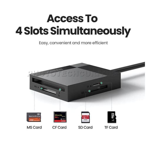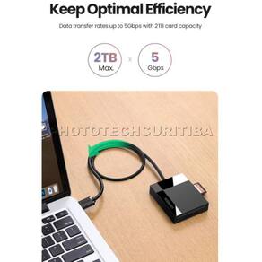 Um leitor para cartões múltiplos: o leitor de cartão USB Ugreen foi projetado com 4 slots de cartão: slots SD, Micro SD, CF, MS e conector USB 3.0, que permitem ler e transferir dados da mídia flash mais popular no computador, laptop, tablet através da interface USB 3.0