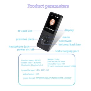 Parâmetros do produto: Tamanho da tela: 1,8 polegadas (polegadas) Capacidade de armazenamento: Suporte máximo de cartão 128 gPotência máxima de saída: 18mw * 2 Faixa de resposta de frequência: 20hz - 20khz Relação sinal-ruído (db): 90 Distorção harmônica total: menos de 0,05% Função de acesso ao arquivo: tipo de bateria: bateria de lítio embutida (embutida) Tempo de reprodução (horas): cerca de 7 horas Tempo de espera (horas): cerca de 24 horas\ nFormato de áudio suporte: WAV/MP3\ nSuporte para ouvir música, assistir vídeos, gravadores (WAV), e-books (formato txt)\ nPlugue de áudio de 3,5 mm, unidade USB sem driver, vários dispositivos nacionais IdiomasEntrada: 5.0v, bateria 500ma 600mAh Tamanho da especificação: 90 mmx38,8mmx8,5mm\ n\ nCaracterísticas: ? Design exterior requintado, pequeno, pequeno e poderoso. ? Use as teclas para operar, a operação é simples.? Música não danificada, gravação profissional em formato wav, qualidade de som de alta qualidade. ? Suporta reprodução em vários formatos, como MP3 e WAV. ? Suporta reprodução de música reprodução de vídeo, gravação, conexão bluetooth, leitura de arquivos de texto txt, rádio fm, função de pasta, cartão TF e função de configuração. ? O reprodutor de MP3 usa uma bateria de íon de lítio de grande capacidade de 450 mah. ? Suporta até 128 GB de expansão de memória