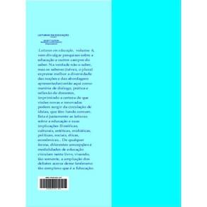 O presente livro Leituras em Educação, v. 6, organizado pelos professores Rodrigo da Costa Araújo e Wilbett Oliveira, vem divulgar pesquisas sobre a educação e outros campos do saber. Na verdade não o saber, mas os saberes (talvez, o plural expresse melhor a diversidade das noções e das abordagens apresentadas) estão aqui como matéria de diálogo, prática e reflexão de docentes, imprimindo a certeza de que visões novas e renovadas podem surgir da circulação de ideias, que têm fundo comum. Esta é justamente as leituras sobre a educação e suas implicações filosóficas, culturais, estéticas, midiáticas, políticas, sociais, éticas, econômicas... De qualquer forma, diferentes concepções e modalidades de educação circulam neste livro. Marca: CAJUINA EDITORA